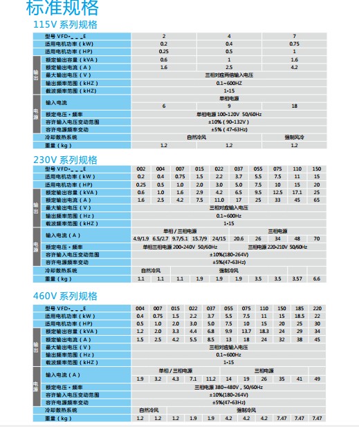 VFD-E VFD022E23A 3P220V,2200W,IP20,内置煞车单元