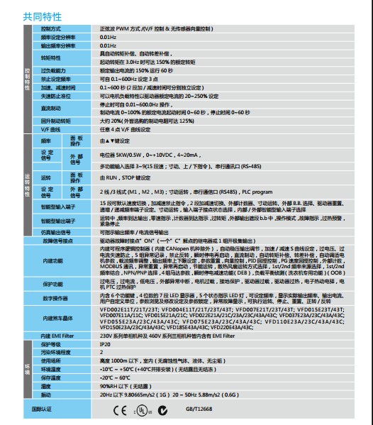 VFD-E VFD022E43C 3P460V,2200W,IP20,内置CanoPen通讯接口、EMI滤波器、剎车单元