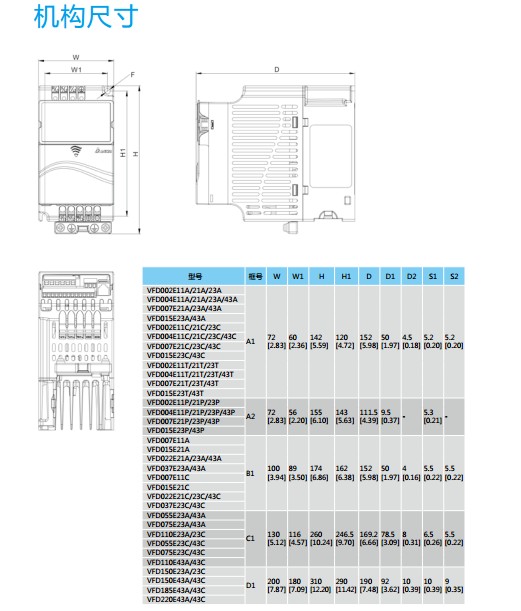 VFD-E VFD002E21A 1P230V,200W,IP20,未内置煞车单元(可选配卡),EMI Filter内置,内置小PLC