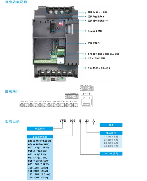 VFD-E VFD022E21A 1P230V,2200W,IP20,内置煞车单元,EMI Filter内置,内置小PLC